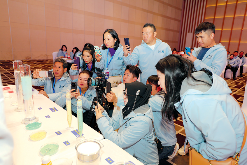 自2024年以来,纳米农药成为农药行业布局的热门赛道,农药头部企业相继入局。纳米农药由于其小的尺寸效应和大的比表面积,显著提高了农药的分散性和生物利用率,具有药效高、使用量少、持效期长、环境友好等优势,有望成为农药行业绿色创新的主流。但纳米农药技术含量高,真正掌握纳米科技的企业仍然属于少数。图为在明德立达允纳科技发布会上,经销商围观纳米产品的入水表现。 (王献伟 摄)